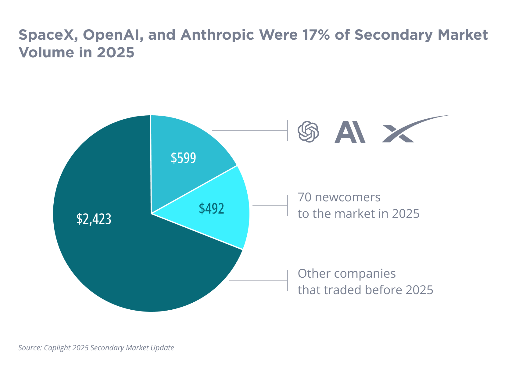 Secondary market volume in 2025 was heavily influenced by a small group of dominant names. SpaceX, OpenAI, and Anthropic alone accounted for a meaningful share of trading activity, reflecting their scale, visibility, and proximity to potential IPOs. With combined valuations representing a significant portion of the pre-IPO universe, these companies naturally attract the deepest pools of capital and the most consistent secondary demand. As they move closer to public markets, they continue to act as liquidity magnets, anchoring pricing and activity across the ecosystem.