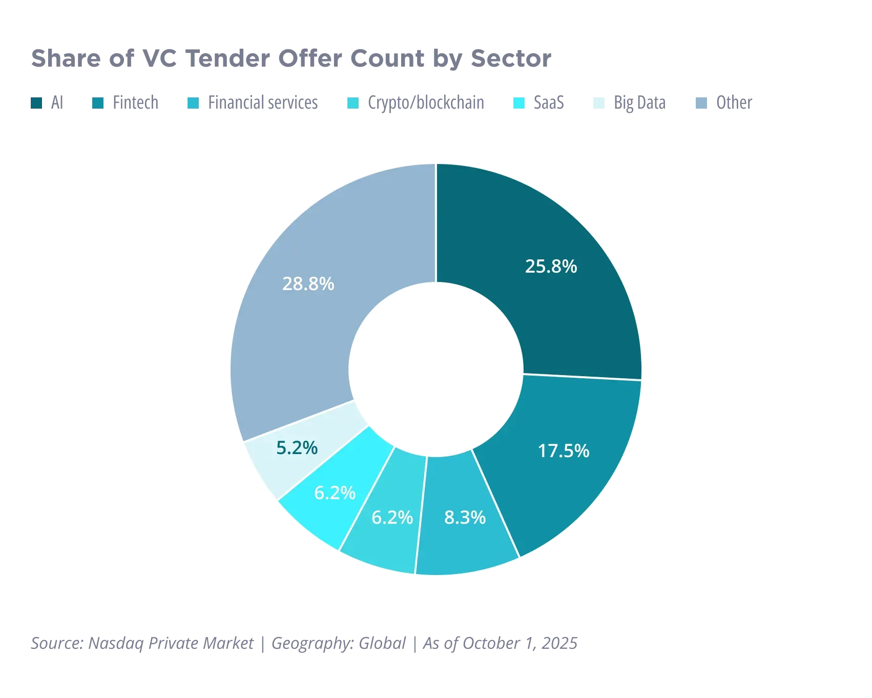 Tender offers highlight where private companies feel the strongest liquidity needs. AI leads by a wide margin, reflecting rapid growth and a need to manage employee and shareholder liquidity as valuations rise. Fintech and financial services follow, together making up a sizable share due to regulatory demands and ongoing capital requirements. Smaller but notable levels come from SaaS, crypto, and big data.