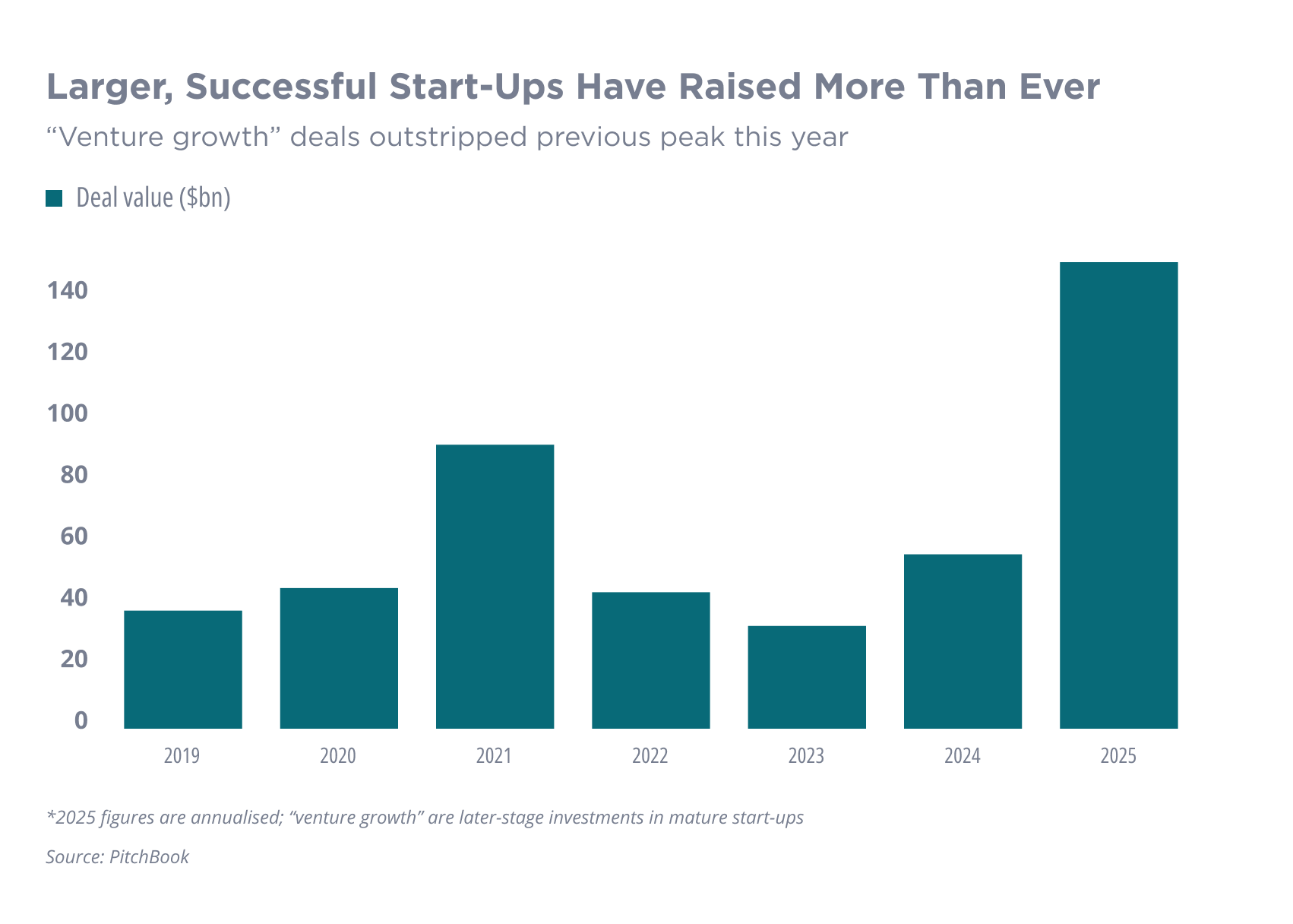 Venture growth investing has pushed past its prior peak, driven not by broad risk appetite but by a narrow set of exceptionally large financings. Capital is clustering around a small group of AI and data infrastructure leaders that are viewed as foundational to the next economic cycle. Mega rounds from companies such as OpenAI and Anthropic account for a disproportionate share of this activity. At the same time, a second tier of fast-scaling AI platforms continues to rise repeatedly. When conviction is high, investors are willing to deploy size, but they are doing so with far greater discipline than in earlier cycles.